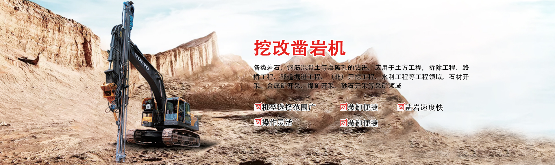 公司主要致力于挖改鉆機(jī)、鑿巖臺(tái)車(chē)、鉆劈一體機(jī)設(shè)備研發(fā)、制造、銷(xiāo)售。
